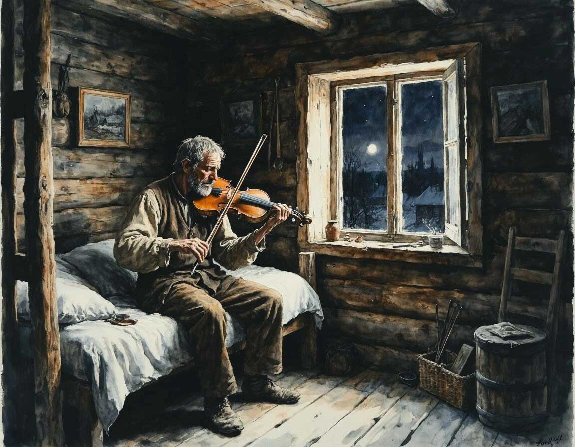 Вася сел на топчане, повертел деревянные штыречки скрипки, потрогал смычком струны.