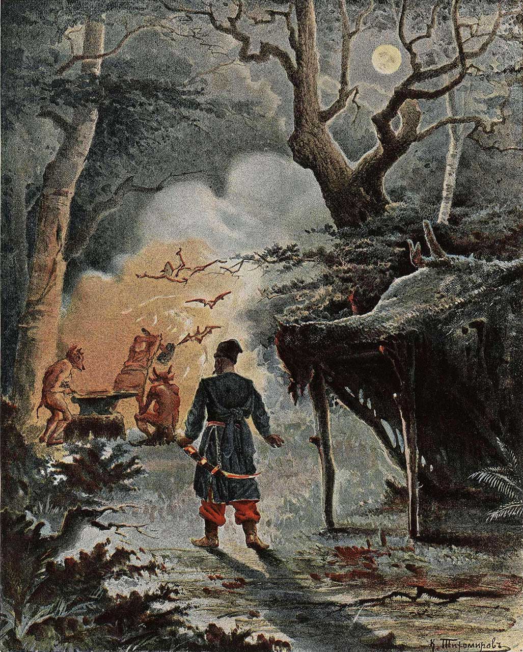 — Я научу тебя, как найти грамоту, — сказал он, отводя его в сторону. У деда и на сердце отлегло. — Я вижу уже по глазам, что ты козак — не баба. Смотри же! близко шинка будет поворот направо в лес. Только станет в поле примеркать, чтобы ты был уже наготове. В лесу живут цыганы и выходят из нор своих ковать железо в такую ночь, в какую одни ведьмы ездят на кочергах своих. Чем они промышляют на самом деле, знать тебе нечего. Много будет стуку по лесу, только ты не иди в те стороны, откуда заслышишь стук; а будет перед тобою малая дорожка, мимо обожженного дерева, дорожкою этою иди, иди, иди… Станет тебя терновник царапать, густой орешник заслонять дорогу — ты все иди; и как придешь к небольшой речке, тогда только можешь остановиться. Там и увидишь кого нужно; да не позабудь набрать в карманы того, для чего и карманы сделаны… Ты понимаешь, это добро и дьяволы и люди любят. — Сказавши это, шинкарь ушел в свою конуру и не хотел больше говорить ни слова.