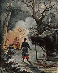 Покойный дед был человек не то чтобы из трусливого десятка; бывало, встретит волка, так и хватает прямо за хвост; пройдет с кулаками промеж козаками — все, как груши, повалятся на землю. Однако ж что-то подирало его по коже, когда вступил он в такую глухую ночь в лес. Хоть бы звездочка на небе. Темно и глухо, как в винном подвале; только слышно было, что далеко-далеко вверху, над головою, холодный ветер гулял по верхушкам дерев, и деревья, что охмелевшие козацкие головы, разгульно покачивались, шепоча листьями пьяную молвь. Как вот завеяло таким холодом, что дед вспомнил и про овчинный тулуп свой, и вдруг словно сто молотов застучало по лесу таким стуком, что у него зазвенело в голове. И, будто зарницею, осветило на минуту весь лес. Дед тотчас увидел дорожку, пробиравшуюся промеж мелкого кустарника. Вот и обожженное дерево, и кусты терновника! Так, все так, как было ему говорено; нет, не обманул шинкарь. Однако ж не совсем весело было продираться через колючие кусты; еще отроду не видывал он, чтобы проклятые шипы и сучья так больно царапались: почти на каждом шагу забирало его вскрикнуть. Мало-помалу выбрался он на просторное место, и, сколько мог заметить, деревья редели и становились, чем далее, такие широкие, какие дед не видывал и по ту сторону Польши. Глядь, между деревьями мелькнула и речка, черная, словно вороненая сталь. Долго стоял дед у берега, посматривая на все стороны. На другом берегу горит огонь и, кажется, вот-вот готовится погаснуть, и снова отсвечивается в речке, вздрагивавшей, как польский шляхтич в козачьих лапах. Вот и мостик! «Ну, тут одна только чертовская таратайка разве проедет». Дед, однако ж, ступил смело и, скорее, чем бы иной успел достать рожок понюхать табаку, был уже на другом берегу. Теперь только разглядел он, что возле огня сидели люди, и такие смазливые рожи, что в другое время бог знает чего бы не дал, лишь бы ускользнуть от этого знакомства. Но теперь, нечего делать, нужно было завязаться. Вот дед и отвесил им поклон мало не в пояс: «Помогай бог вам, добрые люди!» Хоть бы один кивнул головой; сидят да молчат, да что-то сыплют в огонь. Видя одно место незанятым, дед без всяких околичностей сел и сам. Смазливые рожи — ничего; ничего и дед. Долго сидели молча. Деду уже и прискучило; давай шарить в кармане, вынул люльку, посмотрел вокруг — ни один не глядит на него. «Уже, добродейство, будьте ласковы: как бы так, чтобы, примерно сказать, того… (дед живал в свете немало, знал уже, как подпускать турусы, и при случае, пожалуй, и пред царем не ударил бы лицом в грязь), чтобы, примерно сказать, и себя не забыть, да и вас не обидеть, — люлька-то у меня есть, да того, чем бы зажечь ее, черт-ма» (Не имеется. (Прим. Н.В. Гоголя.). И на эту речь хоть бы слово; только одна рожа сунула горячую головню прямехонько деду в лоб так, что если бы он немного не посторонился, то, статься может, распрощался бы навеки с одним глазом. Видя, наконец, что время даром проходит, решился — будет ли слушать нечистое племя или нет — рассказать дело. Рожи и уши наставили, и лапы протянули. Дед догадался: забрал в горсть все бывшие с ним деньги и кинул, словно собакам, им в середину. Как только кинул он деньги, все перед ним перемешалось, земля задрожала, и, как уже, — он и сам рассказать не умел, — попал чуть ли не в самое пекло. «Батюшки мои!» — ахнул дед, разглядевши хорошенько: что 