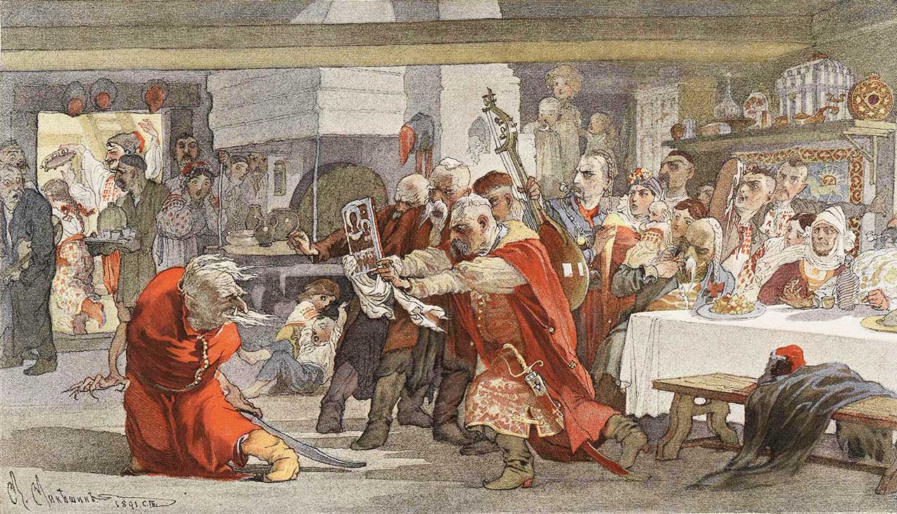 Все сели на полу в кружок: против покута пан отец, по левую руку пан Данило, по правую руку пани Катерина и десять наивернейших молодцов в синих и желтых жупанах.
