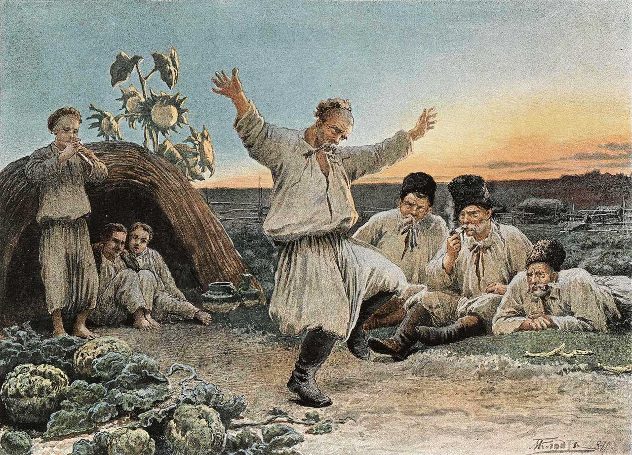 — Что же вы, хлопцы, — сказал дед, — рты свои разинули? танцуйте, собачьи дети! Где, Остап, твоя сопилка? А ну-ка козачка! Фома, берись в боки! ну! вот так! гей, гоп!