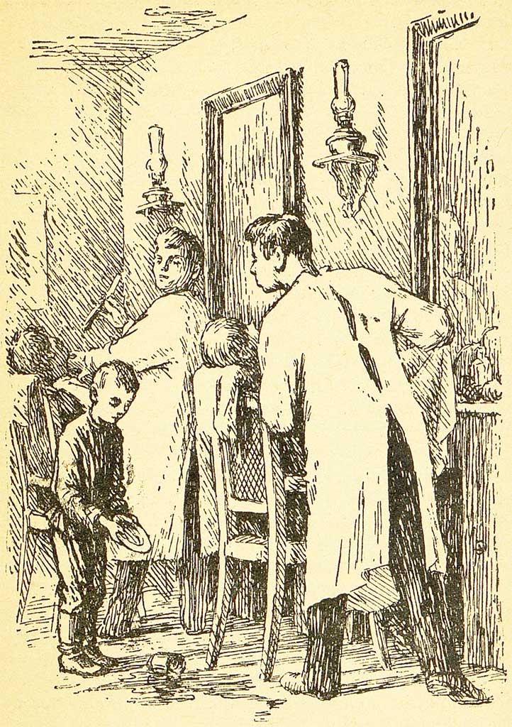 Петькины дни тянулись удивительно однообразно и похоже один на другой, как два родные брата. И зимою и летом он видел все те же зеркала, из которых одно было с трещиной, а другое было кривое и потешное. На запятнанной стене висела одна и та же картина, изображавшая двух голых женщин на берегу моря, и только их розовые тела становились все пестрее от мушиных следов, да увеличивалась черная копоть над тем местом, где зимою чуть ли не весь день горела керосиновая лампа-молния. И утром, и вечером, и весь божий день над Петькой висел один и тот же отрывистый крик: «Мальчик, воды», — и он все подавал ее, все подавал. Праздников не было. По воскресеньям, когда улицу переставали освещать окна магазинов и лавок, парикмахерская до поздней ночи бросала на мостовую яркий сноп света, и прохожий видел маленькую, худую фигурку, сгорбившуюся в углу на своем стуле, и погруженную не то в думы, не то в тяжелую дремоту. Петька спал много, но ему почему-то все хотелось спать, и часто казалось, что все вокруг него не правда, а длинный неприятный сон. Он часто разливал воду или не слыхал резкого крика: «Мальчик, воды», — и все худел, а на стриженой голове у него пошли нехорошие струпья. Даже нетребовательные посетители с брезгливостью смотрели на этого худенького, веснушчатого мальчика, у которого глаза всегда сонные, рот полуоткрытый и грязные-прегрязные руки и шея. Около глаз и под носом у него прорезались тоненькие морщинки, точно проведенные острой иглой, и делали его похожим на состарившегося карлика.