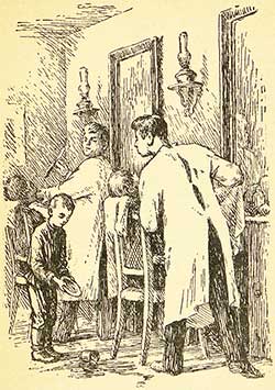 Посетитель, рассматривавший в зеркало свою физиономию с тою обостренною внимательностью и интересом, какие являются только в парикмахерской, замечал, что у него на подбородке прибавился еще один угорь, и с неудовольствием отводил глаза, попадавшие прямо на худую, маленькую ручонку, которая откуда-то со стороны протягивалась к подзеркальнику и ставила жестянку с горячей водой. Когда он поднимал глаза выше, то видел отражение парикмахера, странное и как будто косое, и подмечал быстрый и грозный взгляд, который тот бросал вниз на чью-то голову, и безмолвное движение его губ от неслышного, но выразительного шепота. Если его брил не сам хозяин Осип Абрамович, а кто-нибудь из подмастерьев, Прокопий или Михайла, то шепот становился громким и принимал форму неопределенной угрозы: