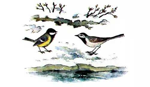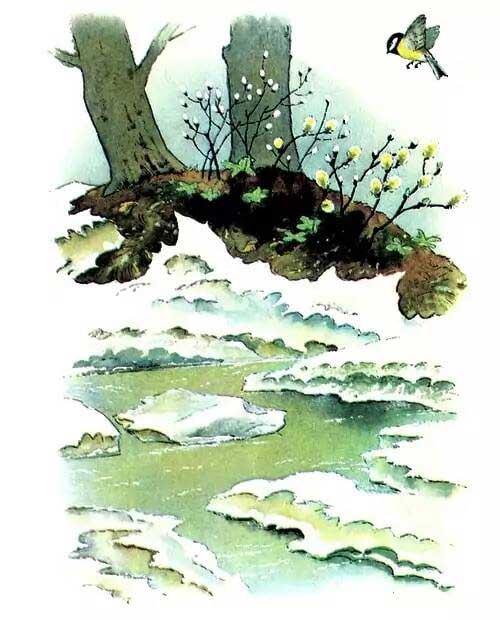 — Зинь-зинь-хо! Зинь-зинь-хо! Ледоход, ледоход! — запела Зинька. И полетела рассказать Старому Воробью, что видела на реке. И старый Воробей сказал ей: — Вот видишь: сперва весна приходит в поле, а потом на реку. Запомни: месяц, в который у нас реки освобождаются ото льда, называется апрель. А теперь лети-ка опять в лес: увидишь, что там будет.