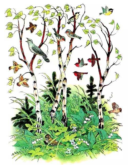 Но уже было в нем весело, не то что зимой. Налетело много разных птиц, и все они порхали между деревьями, прыгали по земле и пели, — пели на ветвях, на макушках деревьев и в воздухе.