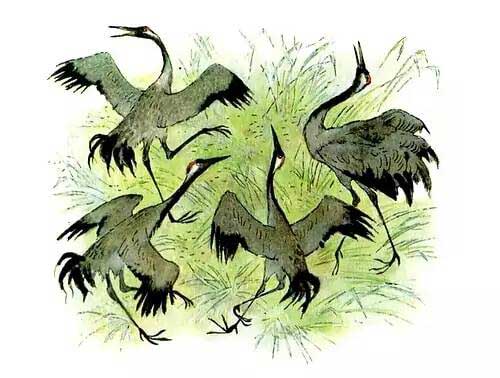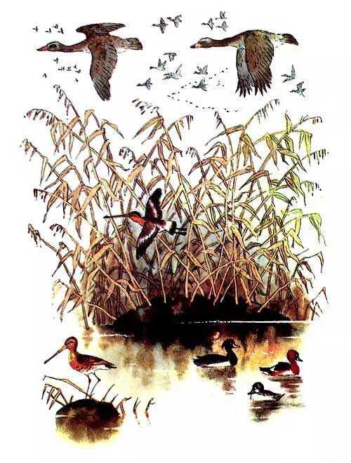 То и дело откуда-то неожиданно появлялись стаи совсем незнакомых Зиньке птиц — долгоногих пестрых куликов, невиданных уток. Они останавливались на речке, на болотах; день покормятся, отдохнут, а ночью летят дальше — в ту сторону, где солнце бывает в полдень. Это пролетали с далекого севера стаи болотных и водяных птиц.
