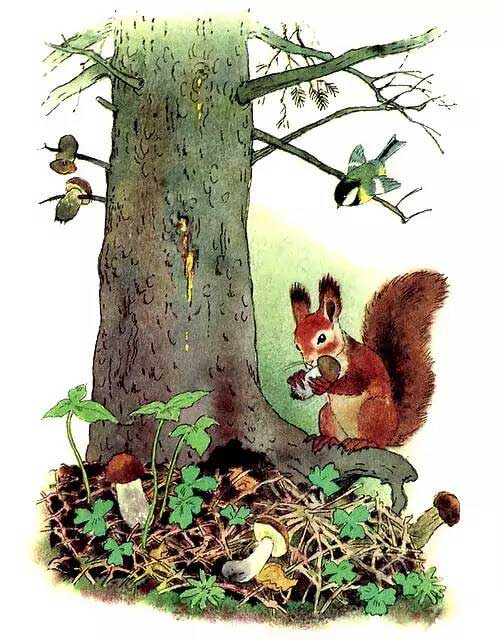 И вот удивилась Зинька, когда белку встретила и разговарилась с ней. Смотрит — белка с дерева на землю спустилась и что-то ищет там в траве.