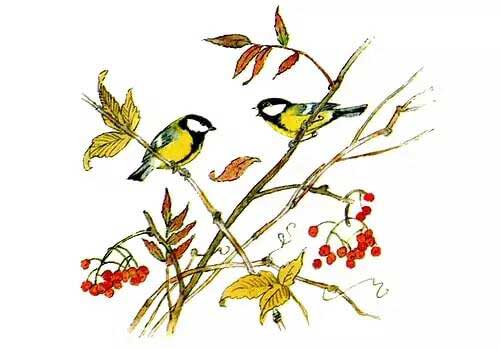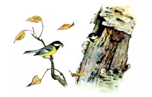 Раз Зинька повстречала в кустах среди поля веселую стайку таких же, как она сама, синиц: белощекие, с желтой грудкой и длинным черным галстуком до самого хвостика. Стайка перелетела полем из леска в лесок.