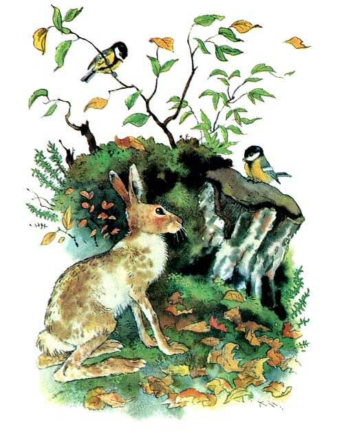 — Так ведь сейчас ни лето, ни зима. Вот и я ни серый, ни белый. — И заяц захныкал: — Вот сижу у березового пенька, дрожу, шевельнуться боюсь. Снегу еще нет, а у меня уже клочья белой шерсти лезут. Земля черная. Побегу по ней днем — сейчас меня все увидят. И так ужасно хрустят сухие листья! Как тихонько ни крадись, прямо гром из-под ног.