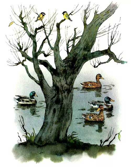 Только было синички зажили спокойно, вдруг опять тревога: ночью неизвестно куда исчезла утка, спавшая на том берегу, — на краю своей стаи.