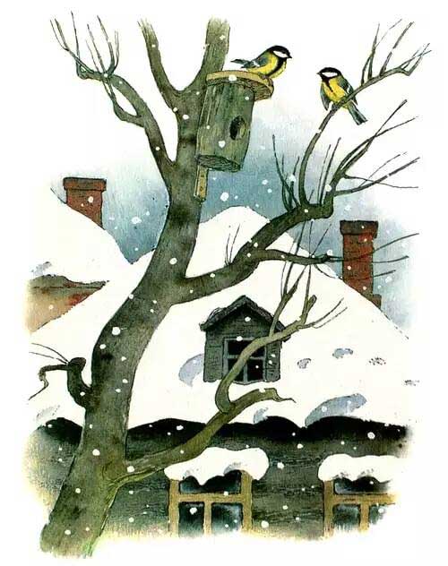 — Но успокойтесь, — сказал Старый Воробей. — Здесь, в городе, никакой невидимка не страшен: если даже он посмеет явиться сюда, люди сейчас же застрелят его. Оставайтесь жить с нами в городе. Вот уже начался месяц декабрь — хвостик года. Пришла зима. И в поле, и на речке, и в лесу теперь голодно и страшно. А у людей всегда найдется для нас, мелких пташек, и приют и еда.