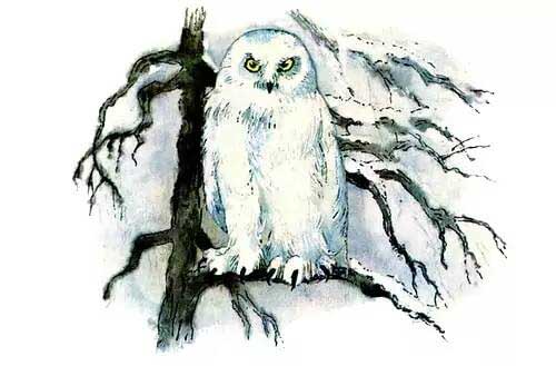 — Это злая зимняя гостья у нас, — объяснял отец Манюне и соседям — полярная сова. Она одинаково хорошо видит и днем и ночью. И от ее когтей нет спасенья ни мыши, ни куропатке, ни зайцу на земле, ни белке на дереве. Летает она совсем бесшумно, а как ее трудно заметить, когда кругом снег, сами видите.