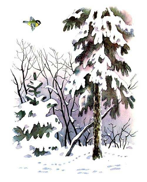 — Ну вот, запомни: январь — первый месяц года — начинается с веселой елки у ребят. Солнце с каждым днем понемножечку начинает вставать раньше и ложиться позже. Свету день ото дня прибывает, а мороз все крепчает, небо все в тучах. А когда проглянет солнышко, тебе, синичке, хочется петь. И ты тихонько пробуешь голос: «Зинь-зинь-тю! Зинь-зинь-тю!»