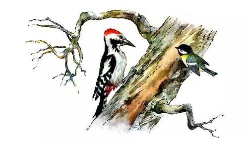 Полетела Зинька дальше в лес; дятла встретила, красношапочника. Подружилась с ним.