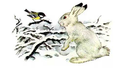 Зинькьа слетела на один из них — поискать под корой насекомышей. Вдруг из-под снега — зверь! Выпрыгнул и сел. Сам весь белый, уши с черными точками держит торчком. Сидит столбиком, глаза на Зиньку выпучил.