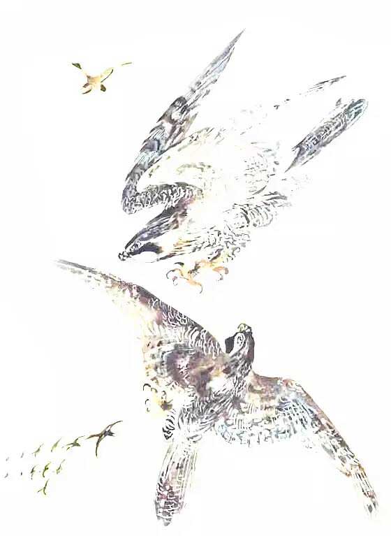 Сапсан мчался всё дальше и дальше. Внизу мелькали деревни, поля, рощи. Наконец он понесся над большим еловым лесом. Стайки мелких птиц то тут, то там показывались над деревьями. Появление сокола мгновенно обращало их в бегство. Они врассыпную кидались вниз, вверх, в стороны — лишь бы оказаться подальше от страшного хищника.