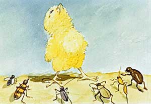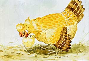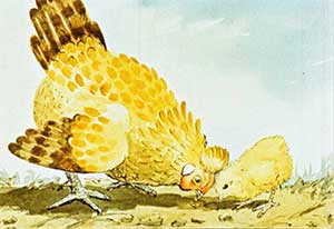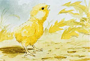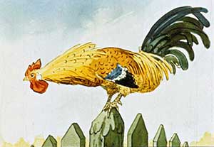 И во все горло закричал «Кукареку!» и важно посмотрел по сторонам: «Я ли не удалец? Я ли не молодец?» Цыпленку это очень понравлось. От тоже вытянул шею. Вот так: