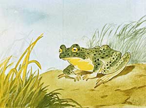 В луже сидела лягушка. она увидала его и засмеялась. «Ха-ха-ха! Ха-ха-ха! Далеко тебе до петуха!» а была лягушка вот такая: