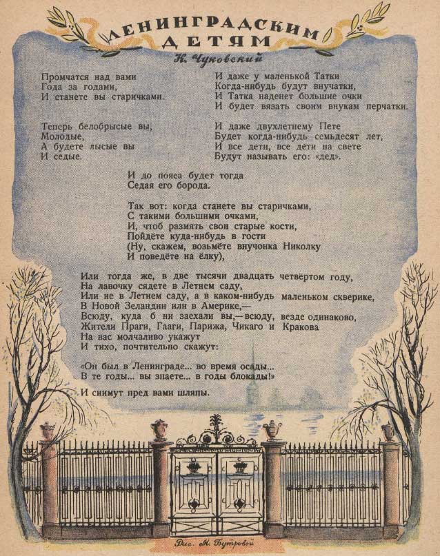 В своём трогательном стихотворении Корней Чуковский обращается к детям, пережившим суровое время ленинградской блокады. Поэт решает представить радостное будущее и долгую жизнь разных ребят, многое испытавших в столь раннем возрасте, и старается предугадать грядущие события тогда ещё далёкого 2024 года...