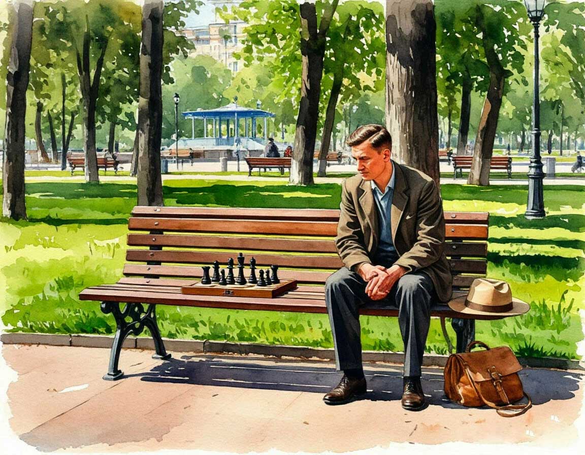 И как только я пришел на бульвар, я увидел, что сегодня почти никого нет, только двое каких-то незнакомых ребят бегают по дорожке, а на скамейке сидит дяденька и сам с собой играет в шахматы. Он сидит на скамейке боком, а позади него лежит его шляпа.