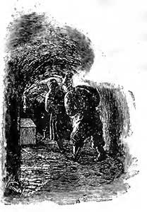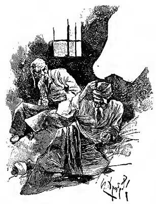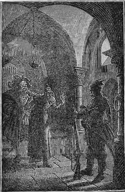 У дверей подземелья, оканчивавшихся кверху острием, стоял гайдук с усами в три яруса. Верхний ярус усов шел назад, другой прямо вперед, третий вниз, что делало его очень похожим на кота.