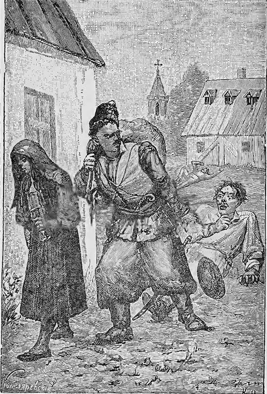 Когда увидела мать, что уже и сыны ее сели на коней, она кинулась к меньшому, у которого в чертах лица выражалось более какой-то нежности; она схватила его за стремя, она прилипла к седлу его и с отчаяньем в глазах не выпускала его из рук своих. Два дюжих казака взяли ее бережно и унесли в хату. Но когда выехали они за ворота, со всею легкостию дикой козы, несообразно летам, выбежала она за ворота, с непостижимою силою остановила лошадь и обняла одного из сыновей с какою-то помешанною, бесчувственною горячностию; ее опять увели.