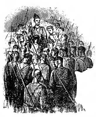 Довбиш вынул тотчас из кармана палки, которые он взял с собою, очень хорошо зная окончание подобных происшествий. Литавры грянули, — и скоро на площадь, как шмели, стали собираться черные кучи запорожцев. Все собрались в кружок, и после третьего боя показались, наконец, старшины: кошевой с палицей в руке, знаком своего достоинства, судья с войсковою печатью, писарь с чернильницею и есаул с жезлом. Кошевой и старшины сняли шапки и раскланялись на все стороны казакам, которые гордо стояли, подпершись руками в бока.