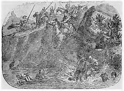 Пустились казаки во всю прыть подгорной дорожкой; а уж погоня за плечами. Видят: путается и загибается дорожка и много дает в сторону извивов. «А, товарищи! не куда пошло!» — сказали все, остановились на миг, подняли свои нагайки, свистнули — и татарские их кони, отделившись от земли, распластавшись в воздухе, как змеи, перелетели через пропасть и бултыхнули прямо в Днестр. Двое только не попали в реку, грянулись с вышины об каменья и пропали там навеки с конями, даже не успевши издать крику. А казаки уже плыли с конями в реке и отвязывали челны. Остановились ляхи над пропастью, дивясь неслыханному казацкому делу и думая: прыгать ли им, или нет? Один молодой полковник, живая, горячая кровь, родной брат прекрасной полячки, обворожившей бедного Андрия, не подумал долго и бросился со всех сил с конем за казаками. Перевернулся три раза в воздухе с конем своим и прямо грянулся на острые утесы. В куски изорвали его острые камни, пропавшего среди пропасти, и мозг его, смешавшись с кровью, обрызгал росшие по неровным стенам провала кусты.