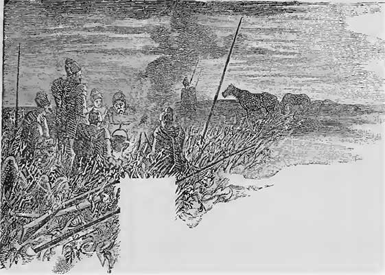 Наши путешественники останавливались только на несколько минут для обеда, причем ехавший с ними отряд, состоявший из десяти казаков, слезал с лошадей, отвязывал деревянные баклажки с горелкою и тыквы, употребляемые вместо сосудов. Ели только хлеб с салом или коржи, пили только по одной чарке, единственно для подкрепления, потому что Тарас Бульба не позволял никогда напиваться в дороге, и продолжали путь до вечера.