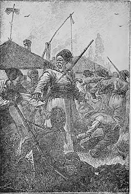Сговорившись с тем и другим, задал он всем попойку, и хмельные казаки в числе нескольких человек повалили прямо на площадь, где стояли привязанные к столбу литавры, в которые обыкновенно били сбор на раду; не нашедши палок, хранившихся всегда у довбиша, они схватили по полену в руки и начали колотить в них. На бой прежде всего прибежал довбиш, высокий человек с одним только глазом, однако ж, несмотря на то, страшно заспанным.