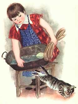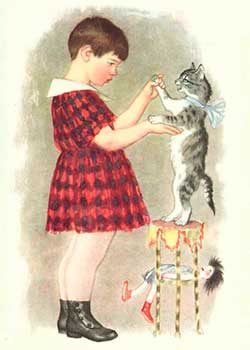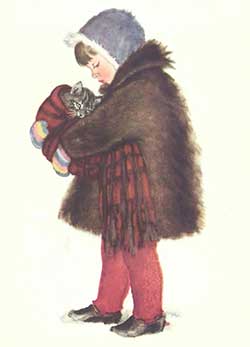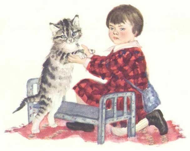 Закутала девочка котенка в платок и пошла с ним в сад.