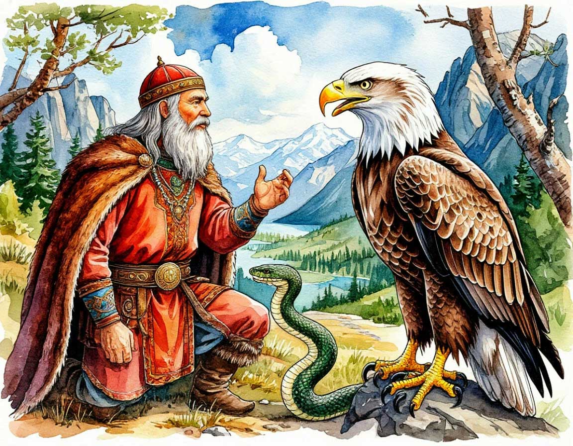 - Я всегда добрым делам советчик, зовут меня Сэркан-былинником. О споре змеи с орлом я давно знаю. Знаю и то, что ты должен решить этот спор.