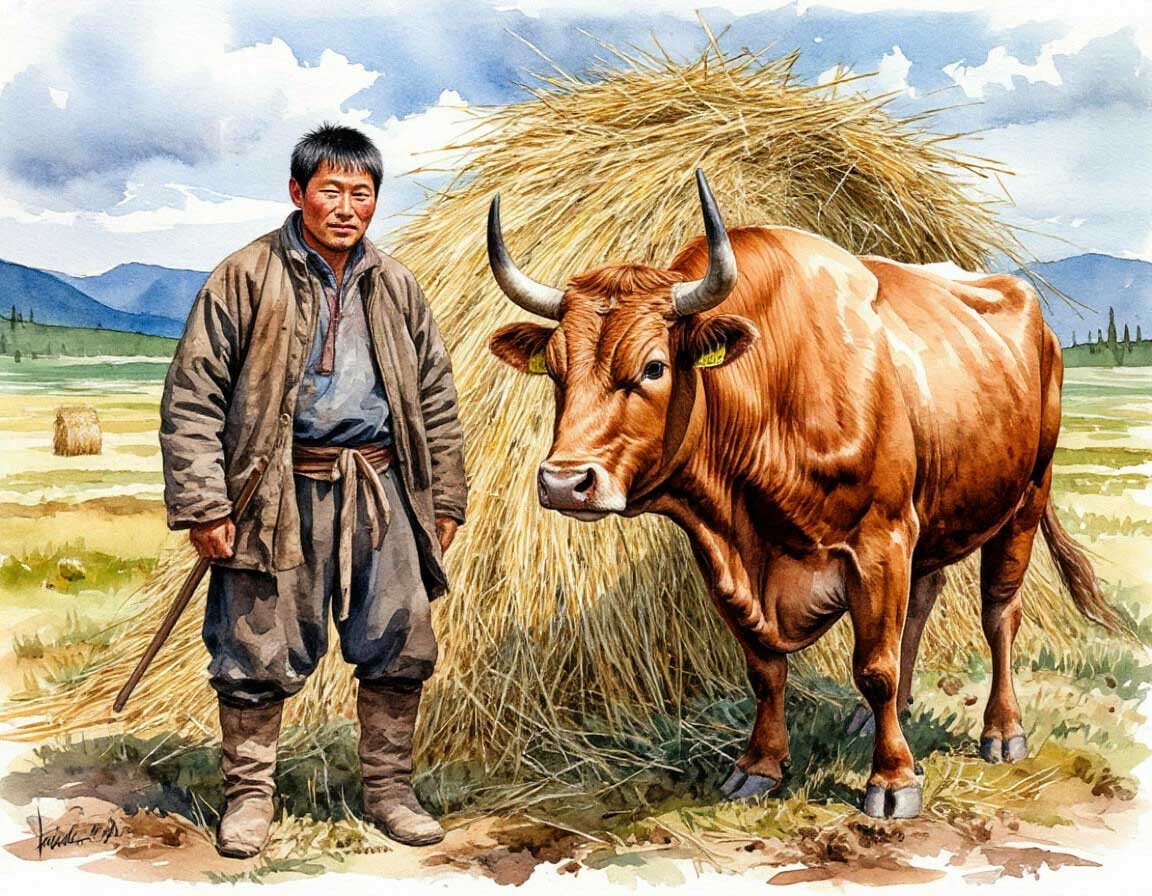 Когда От Сагынньах наутро проснулся, то, к немалому своему удивлению, увидел перед собой богатую еду. На сене лежали и хлеб, и мясо, и всякая другая снедь. Парень начал завтракать, а бык, как ни в чем не бывало, продолжал жевать свое сено.