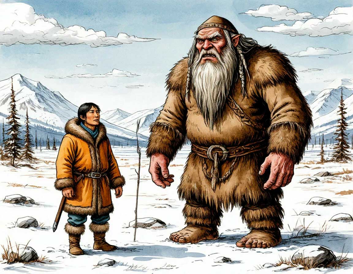 Проучив песца, Тяртекан вышел из чума. В тундру пошел. Людоеда встретил.