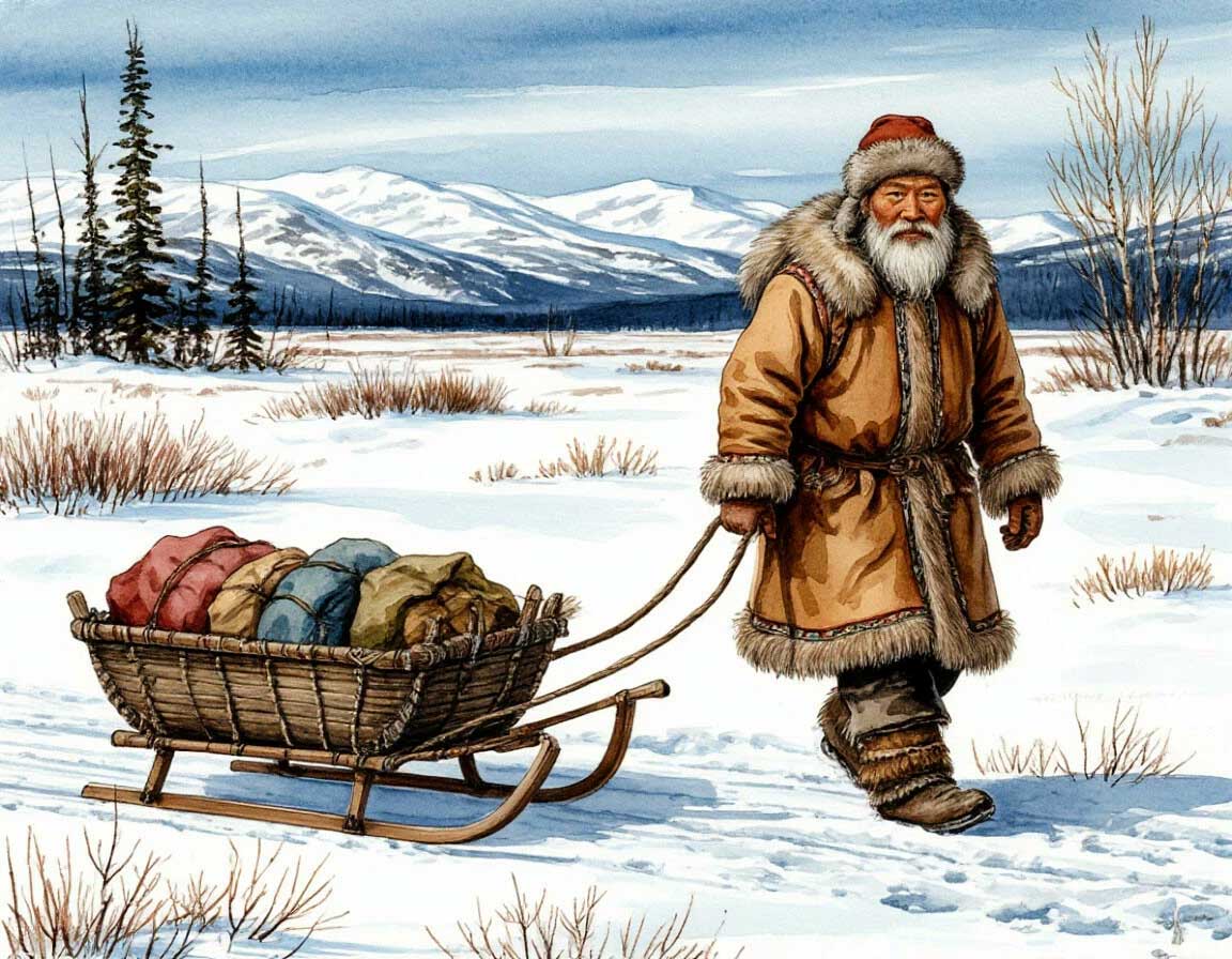 На следующий день Тяртекан за оставленным жиром пошел. Нарту с собой взял. Придя к месту, жир на нарту доложил.