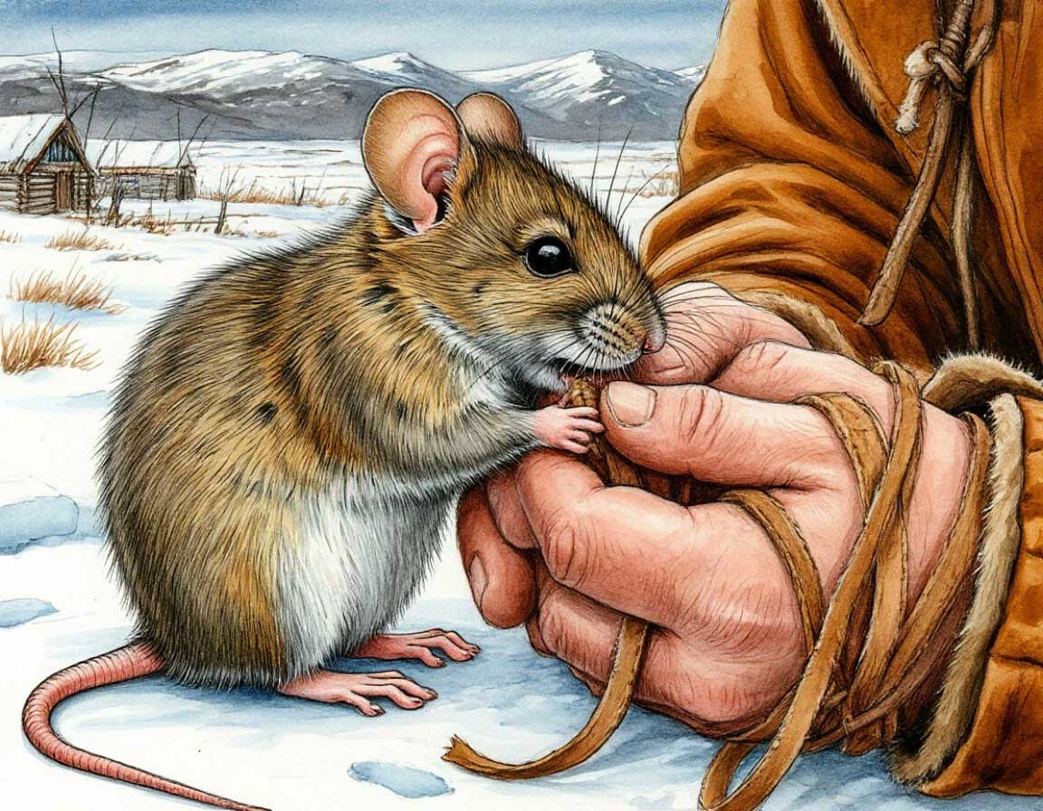 Мышь грызла три дня. Перегрызла ремни из оленьей кожи. Охотник встал, положил мышь в карман. Пошёл по следам грабителей. Дошёл до первого чумища. Здесь грабители ночевали. Увидел рога оленя-манщика. Увидел — заплакал. Жаль было охотнику, что грабители съели такого оленя. Это был лучший из его манщиков. Охотник с ним любил ходить на промысел.