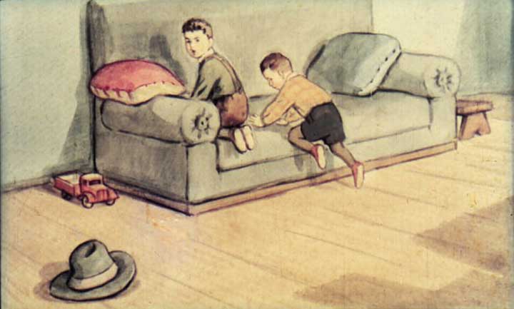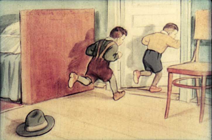 Шляпа вылезла на середину комнаты и остановилась. Ребята смотрят на нее и трясутся от страха. Тут шляпа повернулась и поползла к дивану.