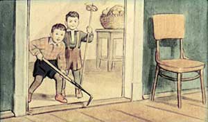 Они взяли клюшку и лыжную палку, приоткрыли дверь и заглянули в комнату.
