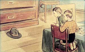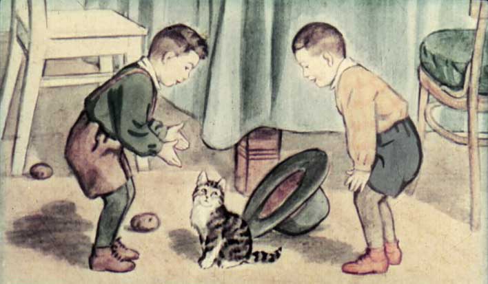 Шляпа лежала на комоде, котенок Васька сидел на полу возле комода, а Вовка и Вадик сидели за столом и раскрашивали картинки. Вдруг позади них что-то плюхнулось - упало на пол. Они обернулись и увидели на полу возле комода шляпу.