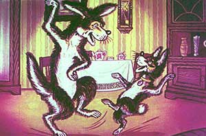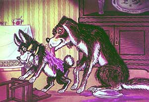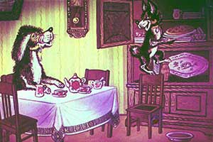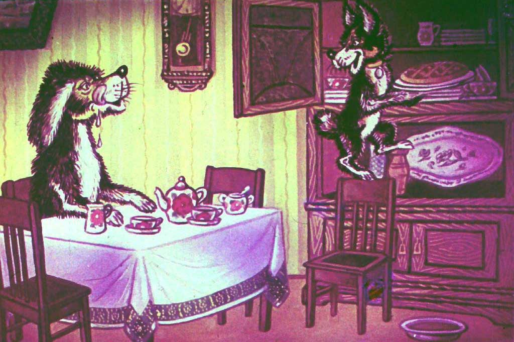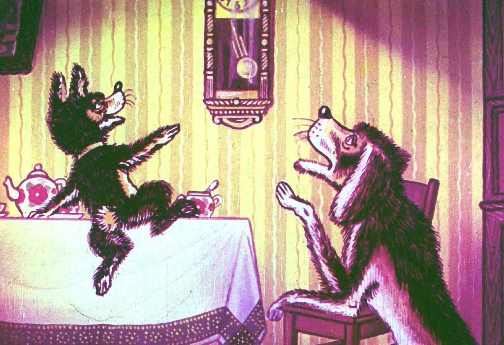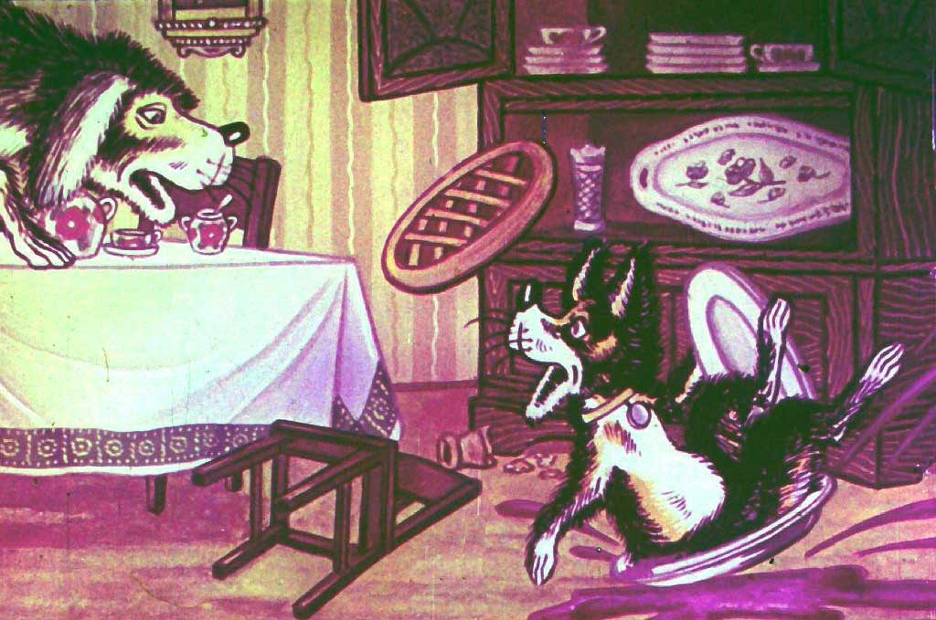 Бобик уселся за стол. Барбоска открыл буфет, видит — там блюдо с киселём стоит, а на верхней полке — большой пирог. Он взял блюдо с киселём, поставил на пол, а сам полез на верхнюю полку за пирогом. Взял его, стал вниз спускаться и попал лапой в кисель. Поскользнувшись, он шлёпнулся прямо на блюдо, и весь кисель у него размазался по спине.