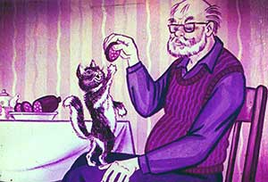Васька пошёл к дедушке, стал мурлыкать и тереться спинкой о его ноги. Дедушка дал ему кусочек колбаски. Васька половину съел сам, а другую половинку отнёс под кровать Барбоске.