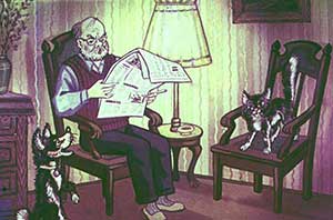 “Дедушке нашему хорошо! — подумал Барбоска. — Ушёл на работу и работает. Ваське тоже неплохо — убежал из дому и гуляет по крышам. А мне вот приходится сидеть, сторожить квартиру”.