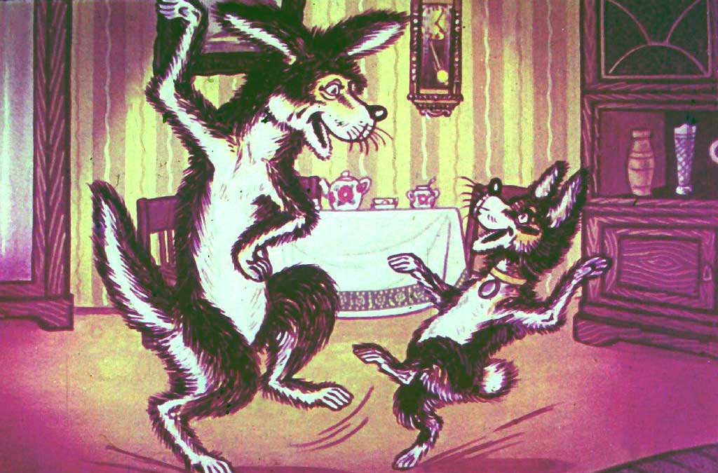 Барбос включил телевизор. Послышалась музыка. Собаки обрадовались, и давай прыгать по комнате. Плясали, плясали, из сил выбились.
