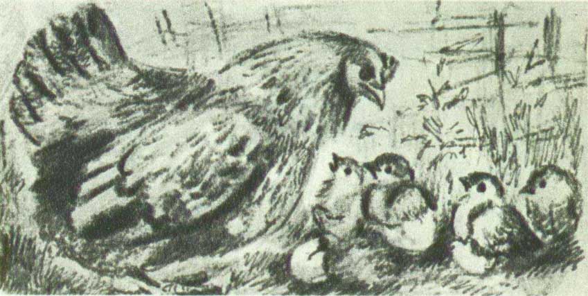 Цыплята послушались, полезли в скорлупу, но не могли никак влезть в неё и только помяли себе крылья. Тогда один цыплёнок и сказал матери: