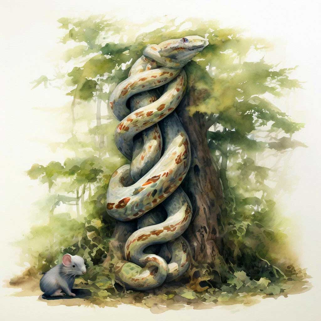 Вот гуляют эти мышки, дышат хорошим воздухом, поправляются. И вдруг видят: на дереве висит огромная змея. И такая страшная змея, что ужас. Глаза у нее горят и пасть раскрыта. Ах, сейчас она, наверно, кого-нибудь проглотит.