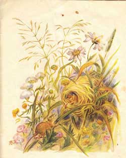 Одна мышь-малютка лезет на стебель, другая сидит на земле, колосок в ручках держит и пастишку разинула: смешно ей, как паучишка на ниточке раскачивается кверх ногами. А за ней на траве замечательное свито гнёздышко из соломинок.Паучку стыдно стало, что он мышей-малюток так испугался. Он и спрашивает у хохотуньи: