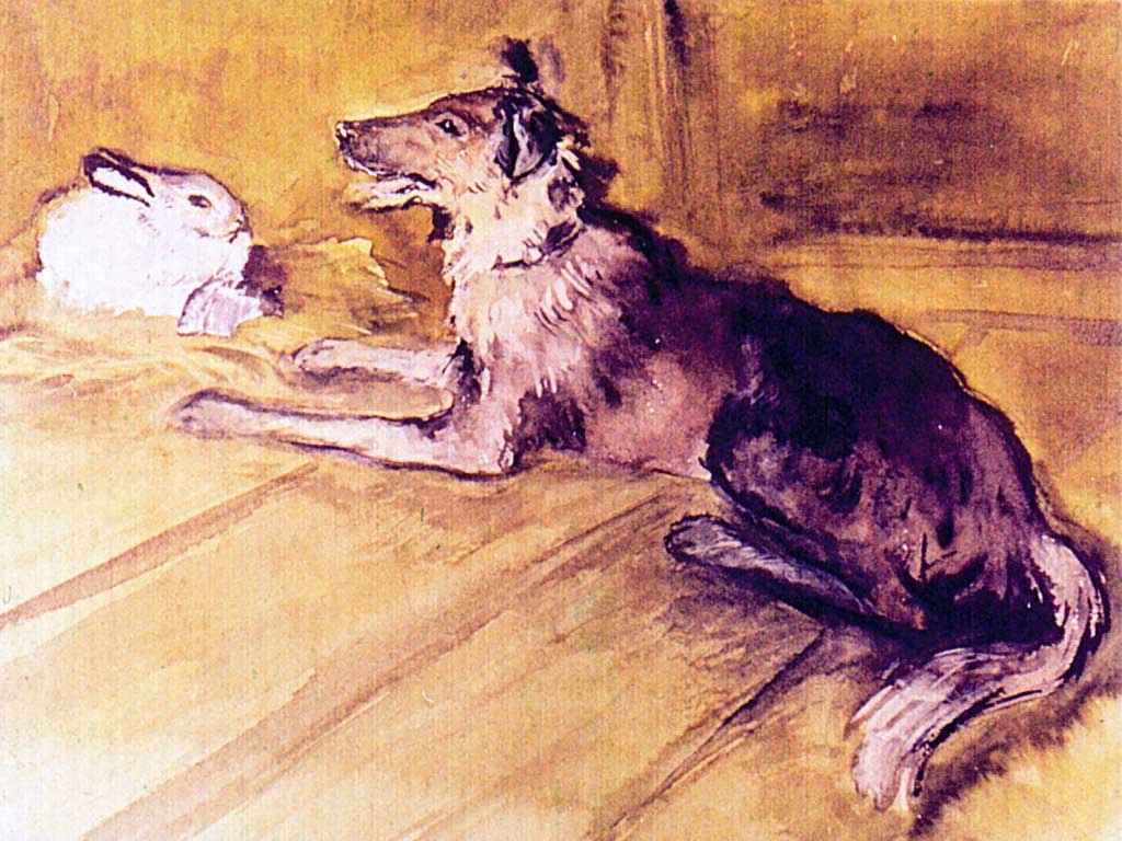 Еремка все время стоял около зайца и ласково помахивал хвостом. Когда Черное Ушко съел все, что было в чашке, Еремка облизал ему морду и начал искать блох.