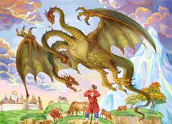 Змей Горыныч - огромный трёхголовый (шестиголовый или двенадцатиголовый) страшный дракон, злодей. Он живёт в своём царстве или пещере и прячет там награбленные богатства и похищенных красавиц. Часто выступает в коварных сговорах с бабой Ягой и Кощеем Бессмертным. Три головы дракона извергают пламя огня и уничтожают всё живое. Он сжигает деревни, ест людей, испепеляет посевы и держит в страхе мирное население. В былинах змей олицетворяет врага русского народа. Змей Горыныч встречается в сказках: "Добрыня и Змей", "Три царства", "Бой на Калиновом мосту"...