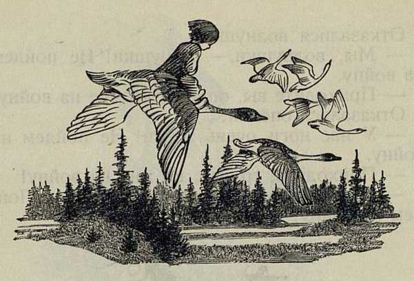 Выбежала она в чистое поле и только видела: метнулись вдалеке гуси-лебеди и пропали за темным лесом. Тут она догадалась, что они унесли ее братца: про гусей-лебедей давно шла дурная слава — что они пошаливали, маленьких детей уносили.