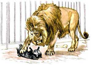 Целый день он бился, метался в клетке и ревел, потом лёг подле мёртвой собачки и затих. Хозяин хотел унести мёртвую собачку, но лев никого не подпускал к ней.